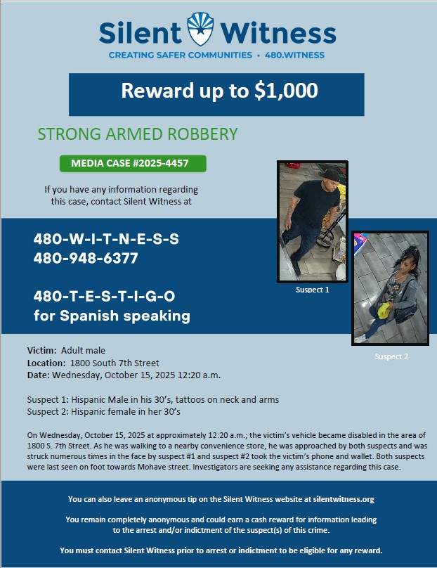On Wednesday, October 15, 2025, at approximately 12:20 a.m.; the victim’s vehicle became disabled in the area of 1800 Sout 7th Street. As he was walking to a nearby convenience store, he was approached by both suspects and was struck numerous times in the face by suspect #1 and suspect #2 took the victim’s phone and wallet. Both suspects were last seen on foot towards Mohave Street. Investigators are seeking any assistance regarding this case.