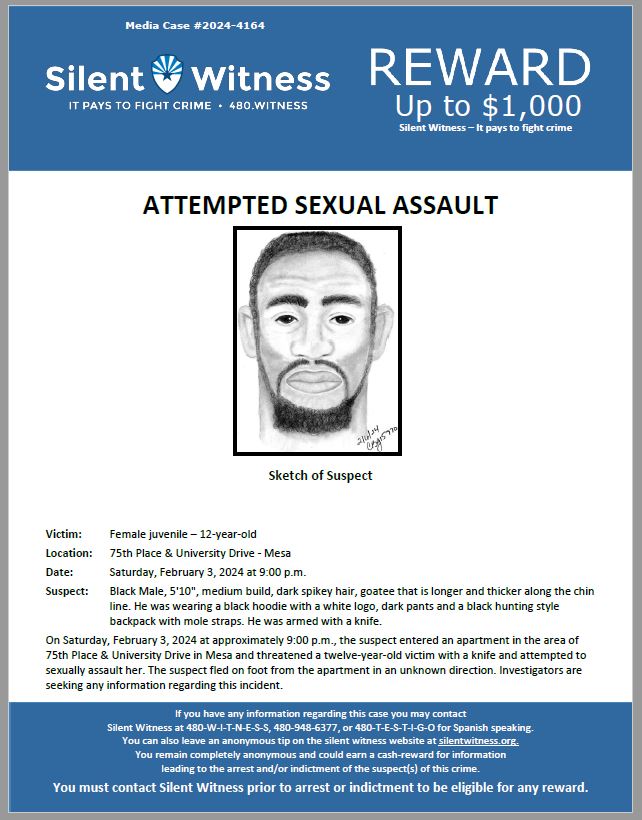 On Saturday, February 3, 2024 at approximately 9:00 p.m., the suspect entered an apartment in the area of 75th Place & University Drive in Mesa and threatened a twelve-year-old victim with a knife and attempted to sexually assault her. The suspect fled on foot from the apartment in an unknown direction. Investigators are seeking any information regarding this incident.