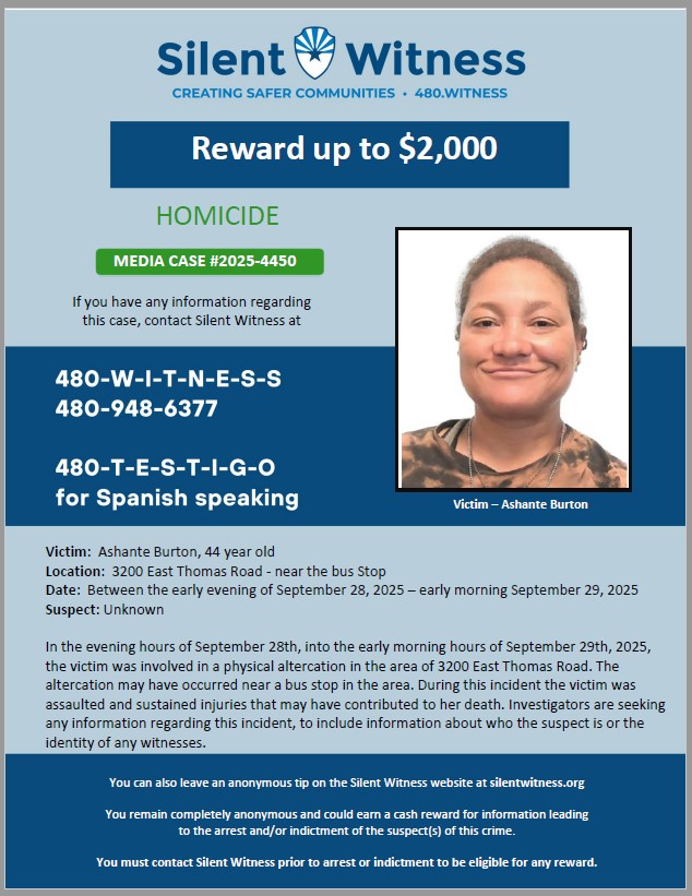 In the evening hours of September 28th, into the early morning hours of September 29th, 2025, the victim was involved in a physical altercation in the area of 3200 East Thomas Road. The altercation may have occurred near a bus stop in the area. During this incident the victim was assaulted and sustained injuries that may have contributed to her death. Investigators are seeking any information regarding this incident, to include information about who the suspect is or the identity of any witnesses.