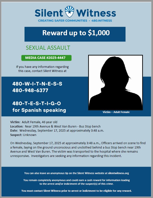 On Wednesday, September 17, 2025 at approximately 3:48 a.m., Officers arrived on scene to find a female, laying on the ground unconscious and unclothed behind a bus Stop bench near 19th Avenue and West Van Buren. The victim was transported to the hospital where she remains unresponsive. Investigators are seeking any information regarding this incident.
