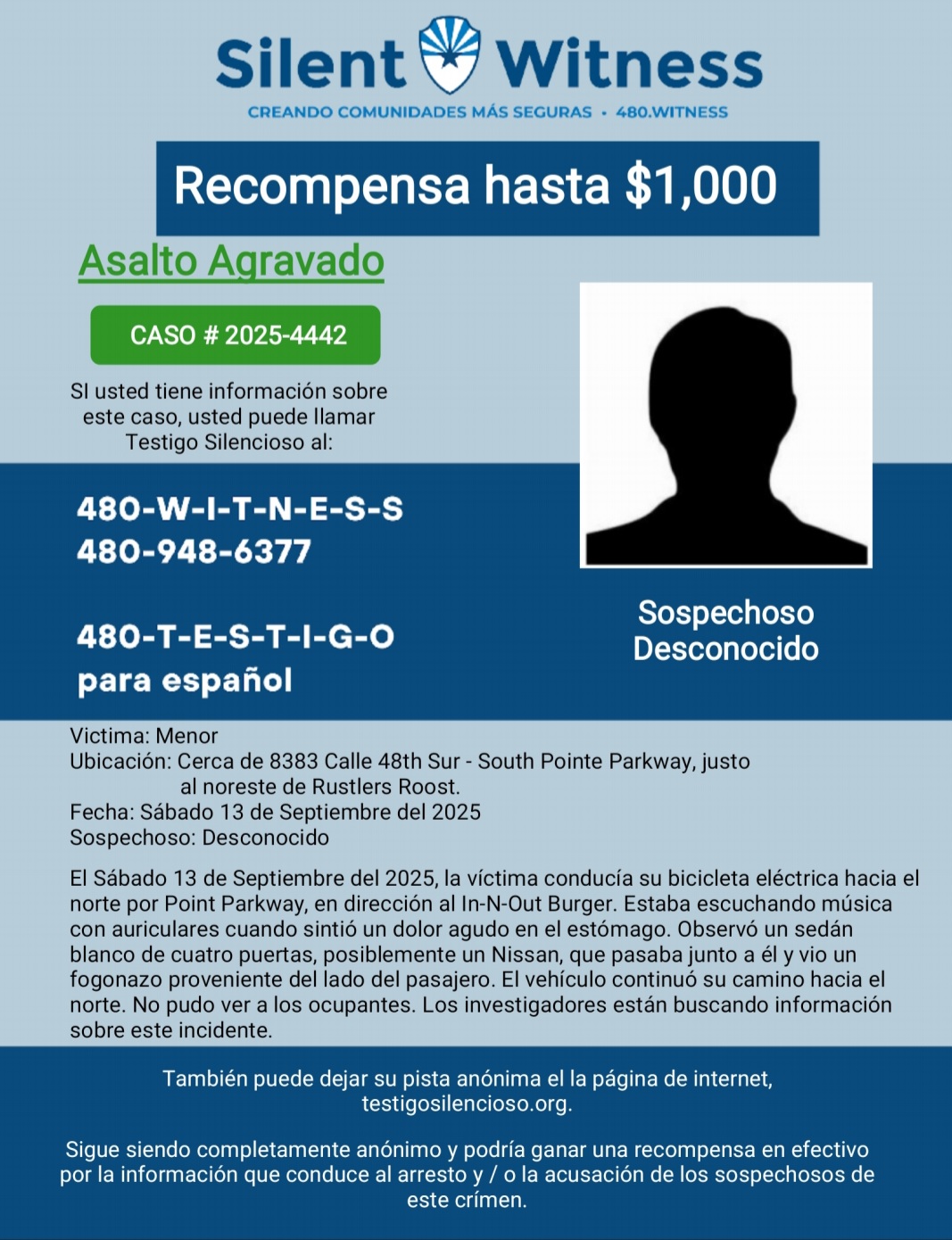 Asalto Agravado / Mujer Adulta / 4300 Indian School Road Oeste July 30, 2025 Ver Caso Ver Folleto Enviar sugerencia