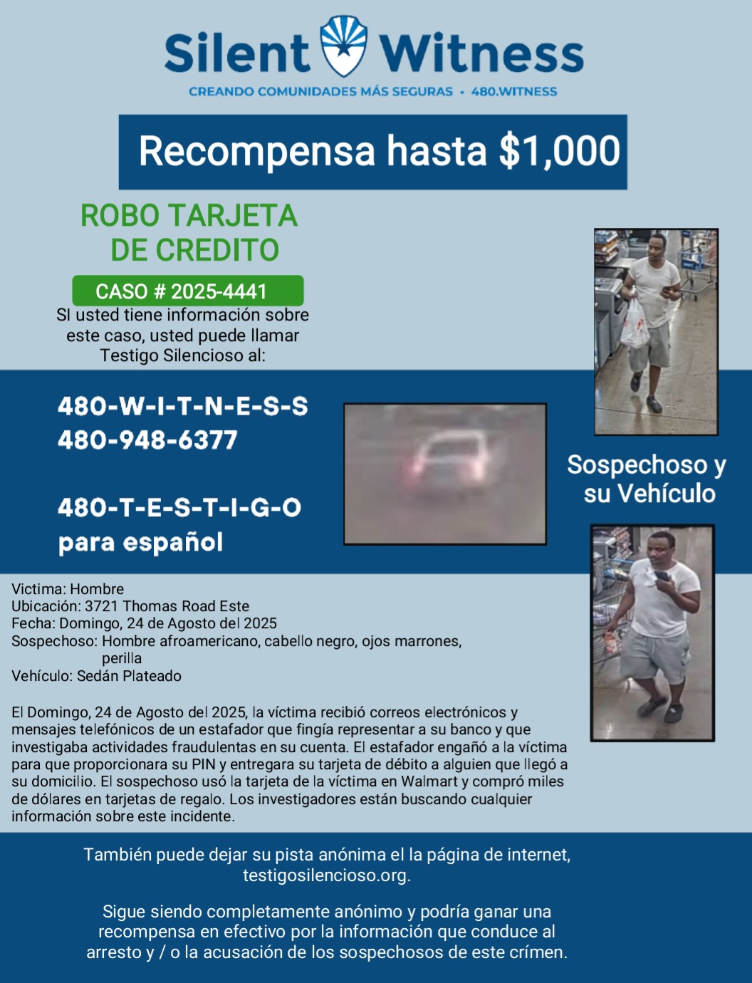 El Domingo, 24 de Agosto del 2025, la víctima recibió correos electrónicos y mensajes telefónicos de un estafador que fingía representar a su banco y que investigaba actividades fraudulentas en su cuenta. El estafador engañó a la víctima para que proporcionara su PIN y entregara su tarjeta de débito a alguien que llegó a su domicilio. El sospechoso usó la tarjeta de la víctima en Walmart y compró miles de dólares en tarjetas de regalo. Los investigadores están buscando cualquier información sobre este incidente.